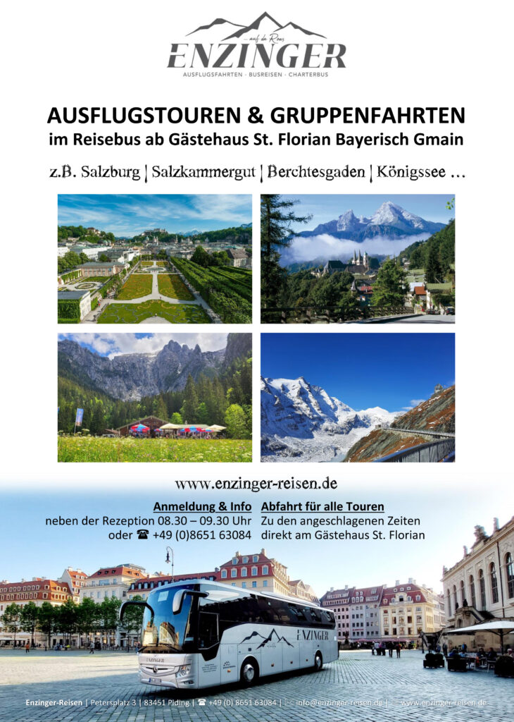 Von der Fa. Enzinger werden täglich Ausflugsfahrten zu besonders reizvollen Zielen in die nähere Umgebung angeboten. Die Ausflugsziele werden neben der Rezeption bekannt gegeben. Täglich zwischen 8.30 Uhr und 9.30 Uhr können Sie sich direkt beim Busfahrer neben der Rezeption anmelden.